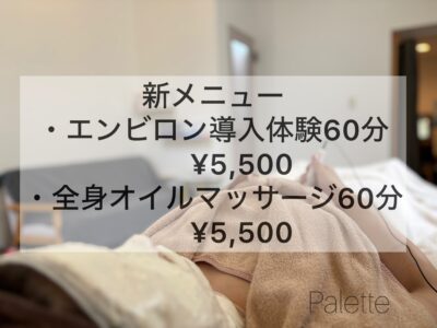 この度Paletteは、新たにご新規さまがPaletteのフェイシャルエステ・ボディマッサージのメニューをお試し頂きやすいように、ご新規さま限定のお試し体験メニューをスタート致しました♪